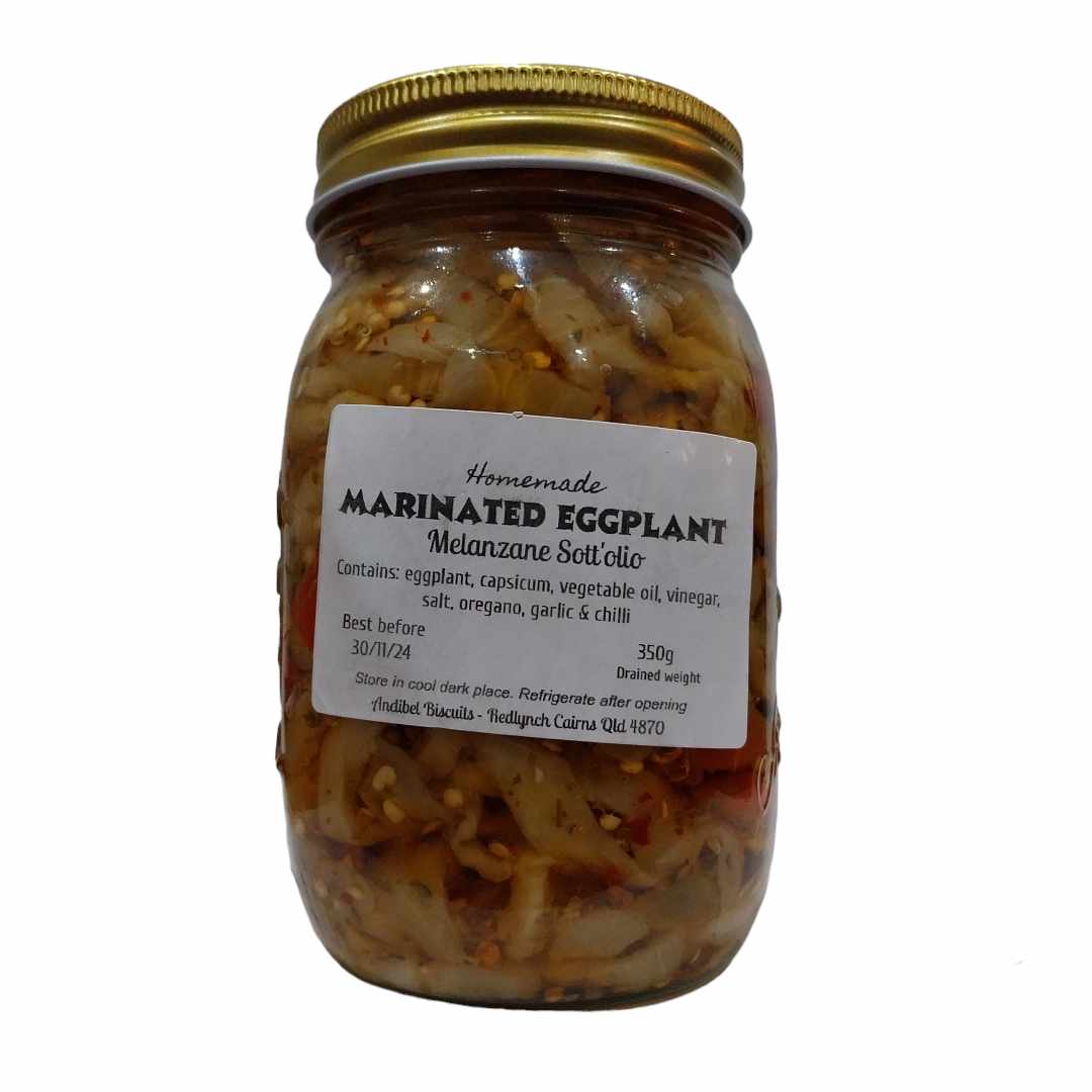 Handmade in Far North Queensland, this Homemade Marinated Eggplant Melanzane Sott'olio offers a classic Mediterranean flavour. Prepared with eggplant, capsicum, vegetable oil, vinegar, salt, oregano, garlic, and chili, it is carefully marinated for a tender texture. Perfect as a snack or a versatile addition to various dishes. Net weight: 350g (drained).