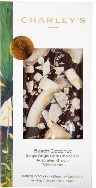 This Signature chocolate is hand crafted in Mission Beach Queensland, and topped with organic coconuts harvested from the beaches in Far North Queensland.