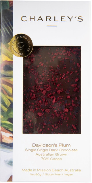 Ingredients: Dark Chocolate (97%). (Cocoa beans (PNG), Sugar (Australia), Cocoa butter (Venezuela or Peru), Soy Lecithin (Germany)). Dried Davidson’s Plum(3%) (Australia), Dark Chocolate contains 70% cocoa solids