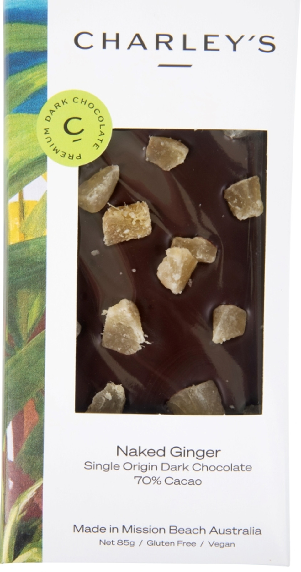 This superb dark chocolate is hand crafted in Mission Beach, Queensland, from single origin Trinitario/Amazonia cocoa beans from Madang Province, Papua New Guinea. The flavour is bold and earthy with fruity overtones. It’s the perfect partner for classic Australian ginger, presented naked, without crystallised sugar coating.