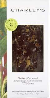 Ingredients: Dark Chocolate (97%). (Cocoa beans (PNG), Sugar (Australia), Cocoa butter (Venezuela or Peru), Soy Lecithin (Germany)). Salted Caramel (Sugar (Australia), Pink Salt Flakes (Australia)). Dark Chocolate contains 70% cocoa solids