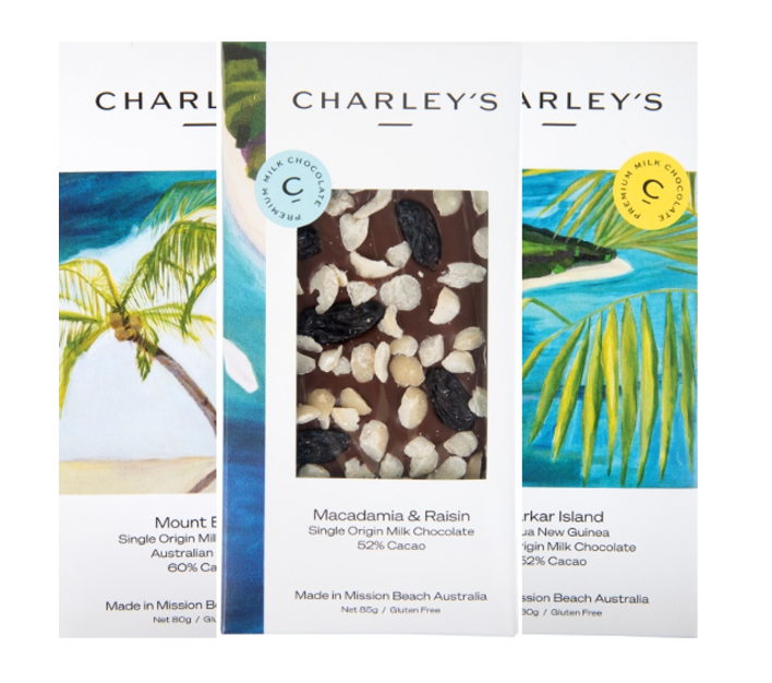 Handmade in Mission Beach, FNQ, Charles Tropical Milk Chocolate offers rich, tropical flavors crafted from locally sourced ingredients. This 3-pack is an ideal treat for chocolate enthusiasts.
