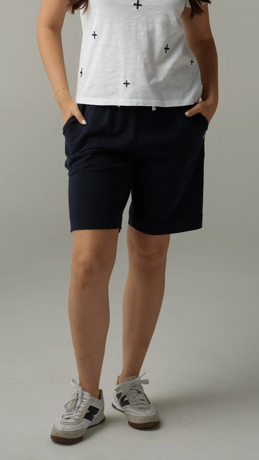 100% Cotton, straight leg, elasticated waist, cross embroidery, waistband external white cotton draw, side seam pockets