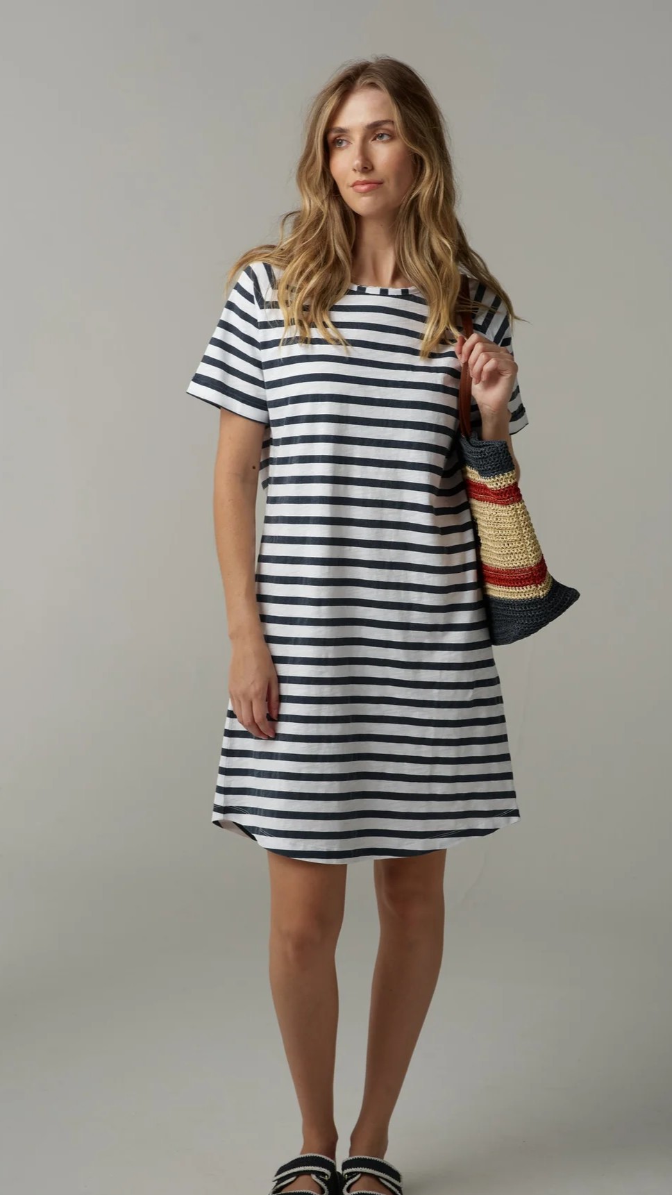 100% Cotton Slub, printed stripe, regular fit, raglan sleeve, crew neck, shaped hem line