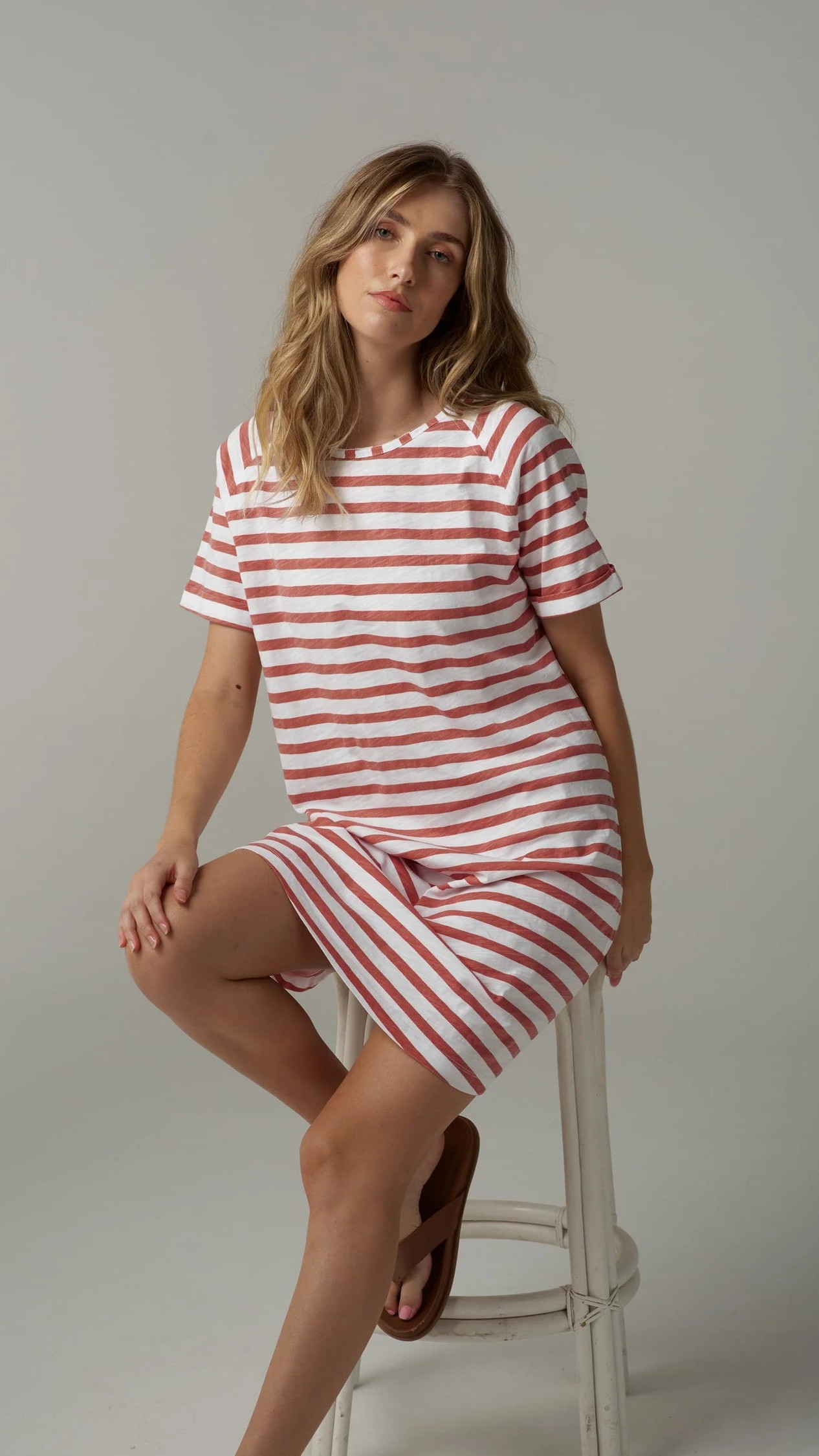 100% Cotton Slub, printed stripe, regular fit, raglan sleeve, crew neck, shaped hem line