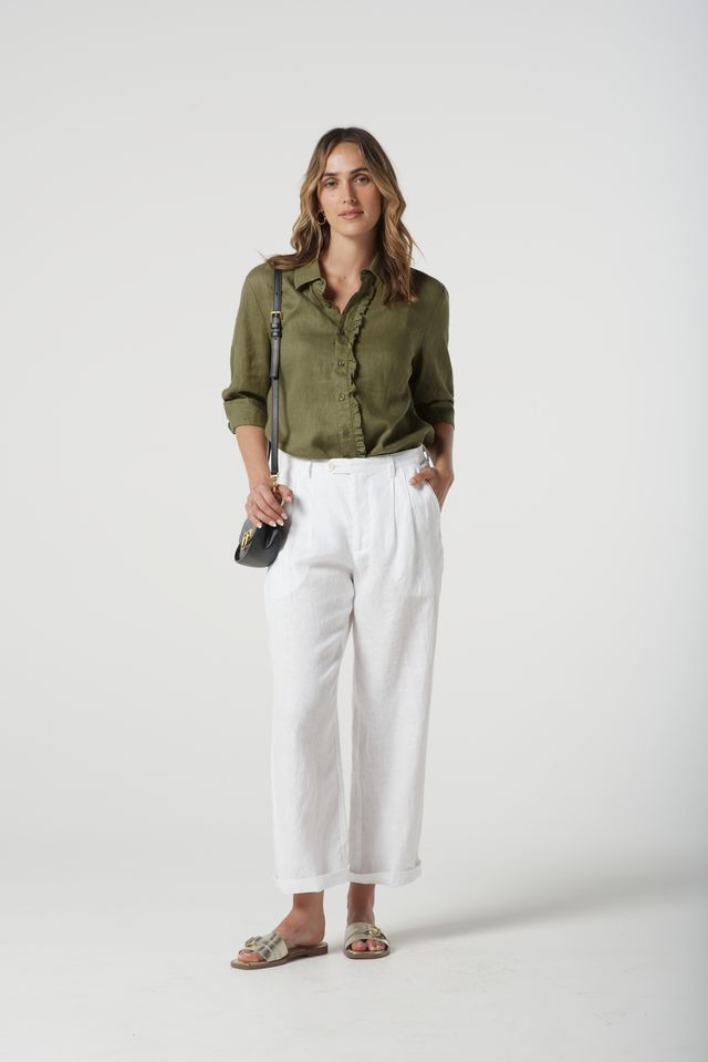 Goondiwindi Cotton Island Linen 3/4 Sleeve Frill Shirt – Sage Green