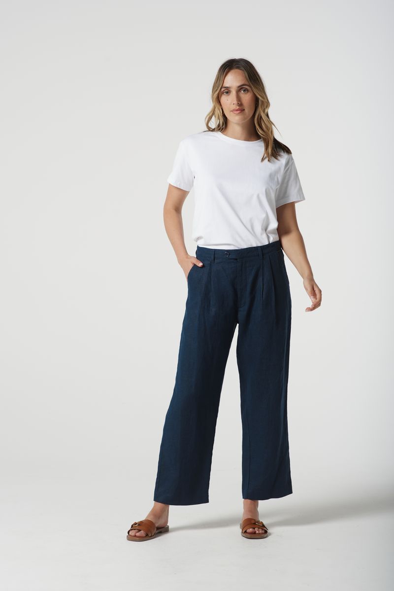 Keywords: Tailored linen pants, dark navy pants, Goondiwindi cotton, breathable linen pants, tailored trousers, summer linen pants, smart-casual pants, Australian fashion, versatile linen pants, comfortable