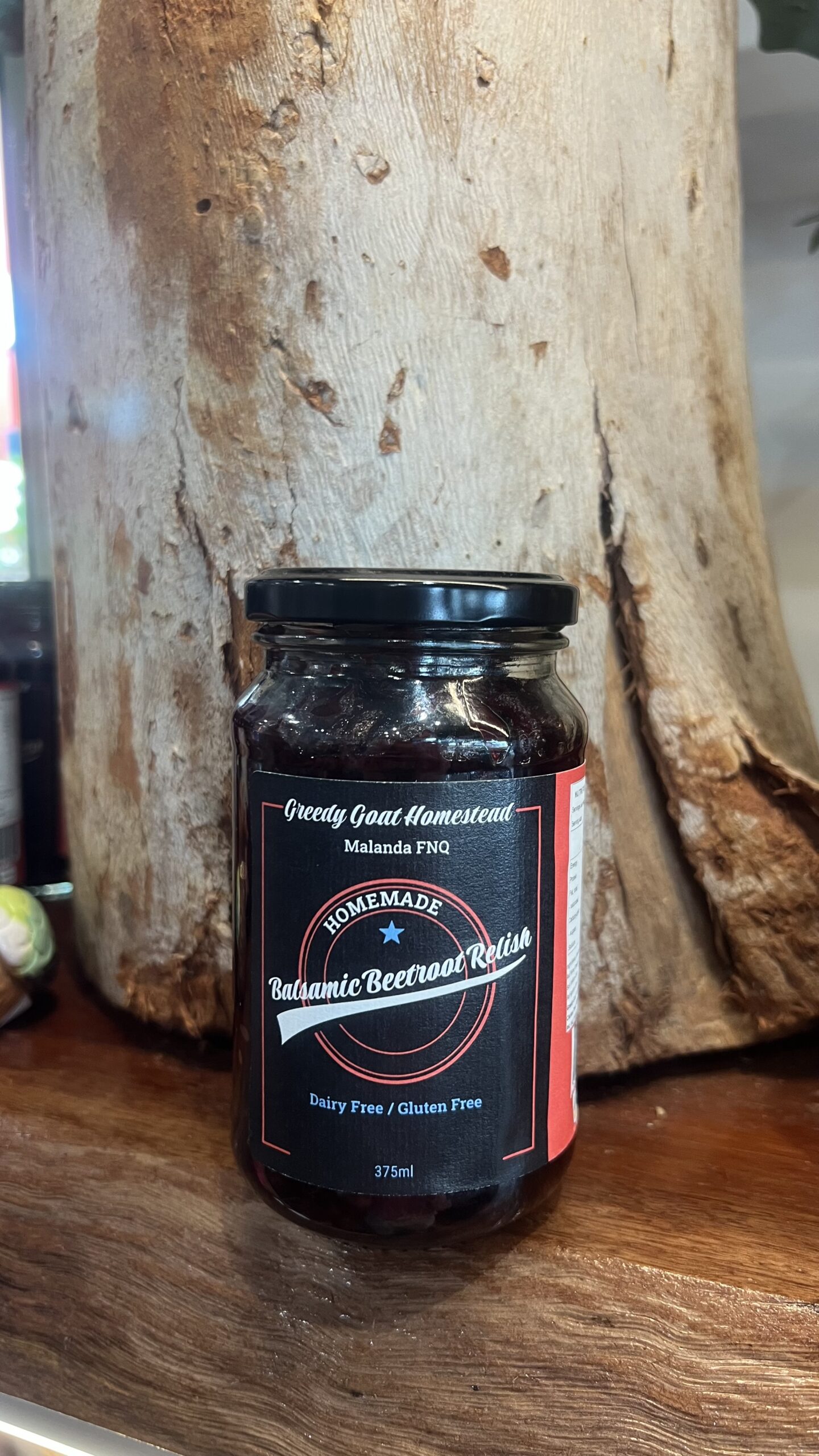 A handcrafted relish combining the earthy sweetness of beetroot with the tangy depth of balsamic vinegar. Perfect as a versatile condiment for pairing with cheese, meats, or salads.