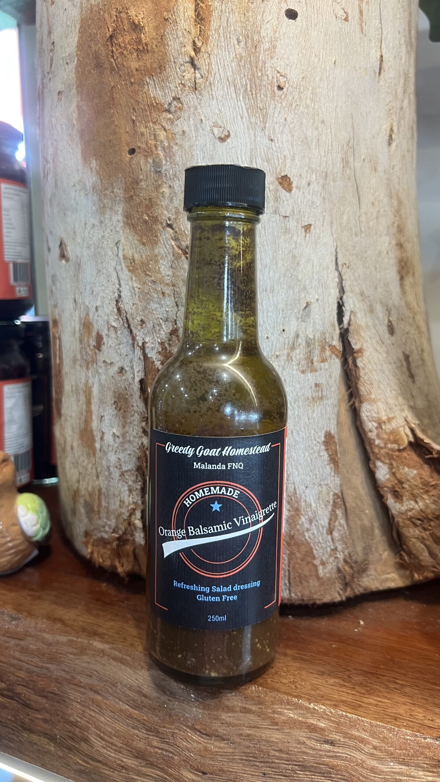 Greedy Goat Homestead's Orange Balsamic Vinaigrette combines a handcrafted blend of citrusy orange and tangy balsamic for a unique flavor profile. Perfect as a salad dressing or marinade, this 250ml bottle offers versatility for your kitchen creations.