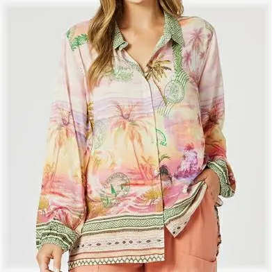 - Infused with wanderlust and tropical charm, the Passport Print Shirt showcases a vibrant sunset palette with palm trees, scenic landscapes, and playful passport stamp motifs.