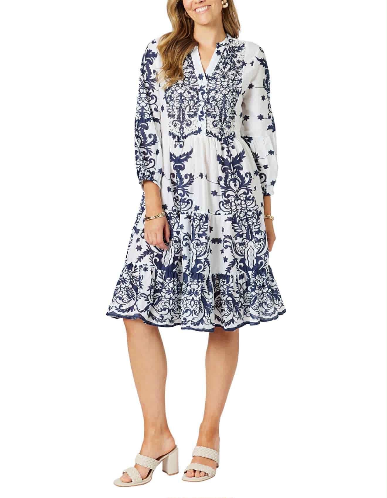The crisp white base is beautifully offset by a classic navy print, giving you that timeless, nautical-inspired vibe. A tiered skirt and soft gathers bring graceful movement with every step, while the beaded neckline adds just the right amount of sparkle for day-to-night versatility.
