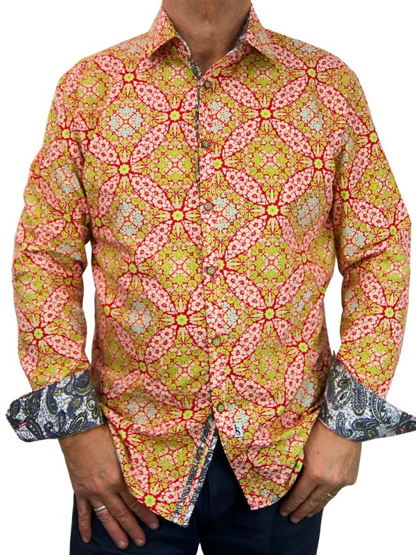 Add a bold touch to your wardrobe with the Australian-made Mexico Abstract Long Sleeve Shirt in vibrant red. Featuring a striking abstract design, this shirt combines eye-catching style with everyday comfort. Crafted with precision, it offers a flattering European fit complete with darts in the back for a tailored look. Perfect for both casual and formal settings, this shirt is made to stand out.