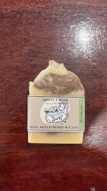 Misty Creek Beatrice FNQ 86% Organic Soap combines nourishing milk, a refreshing mixed berry scent, and clay for gentle exfoliation. The 135g bar is crafted with organic ingredients for a natural cleansing experience.