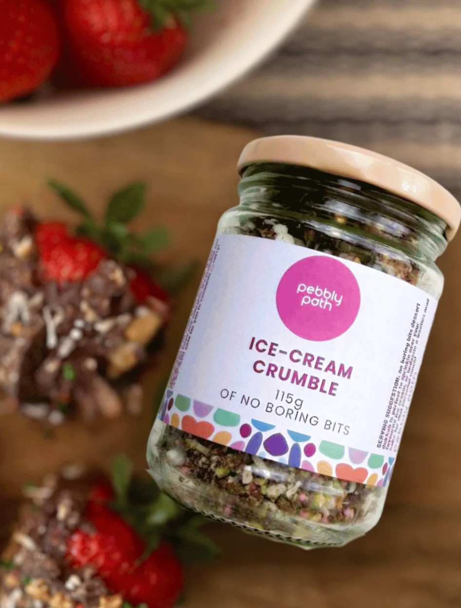 Pebbly Path Ice-cream Crumble combines a crispy texture with a sweet, indulgent flavor for a delightful topping or snack. Each 115g pack ensures a satisfying treat with no boring bits in every bite.