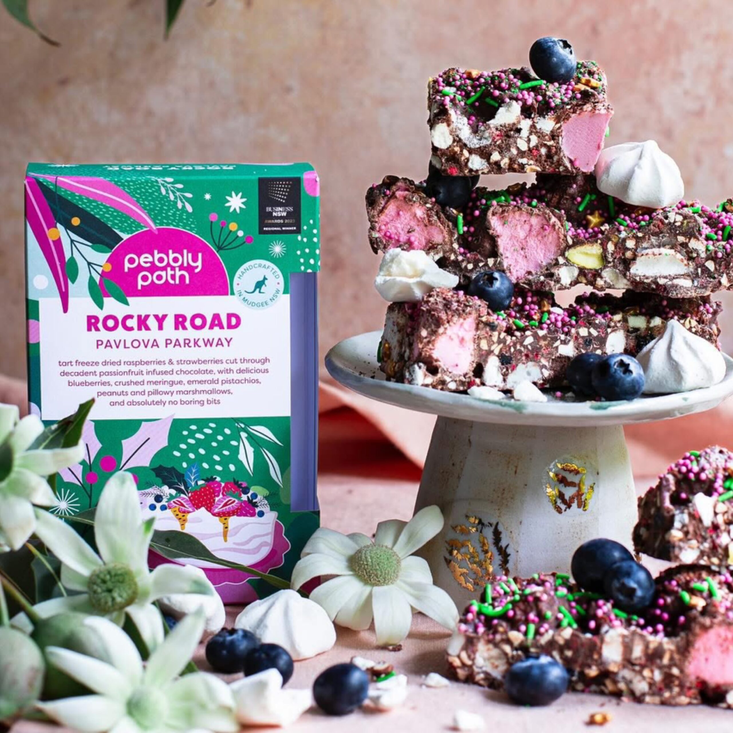 Pebbly Path’s Pavlova Parkway combines the crispness of meringue pieces with a sweet and savory mix of flavors. This indulgent blend includes creamy marshmallows, crunchy nuts, and premium couverture chocolate. A unique twist on a classic dessert, perfect for any occasion.
