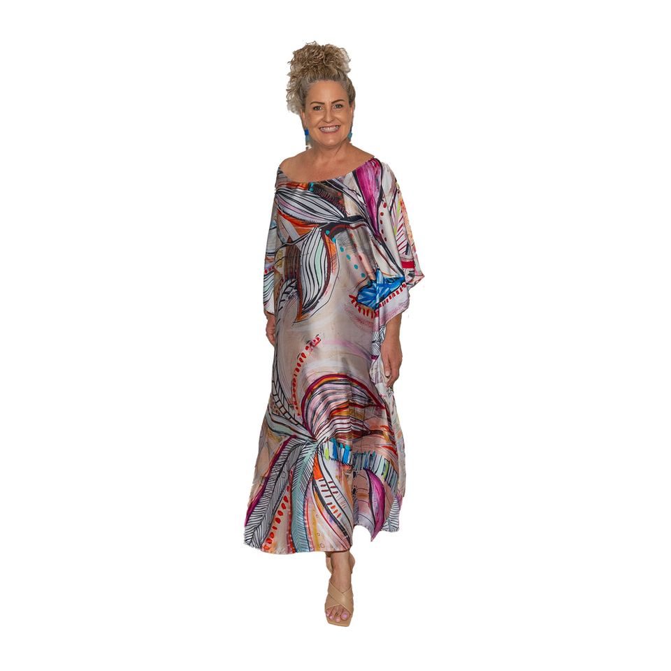 The Limited Edition Mutchilba Kaftan Dress features Regan O’Neill’s original artwork printed on the fabric. Each garment has been carefully put together with quality fabric and is 100% made in Queensland.