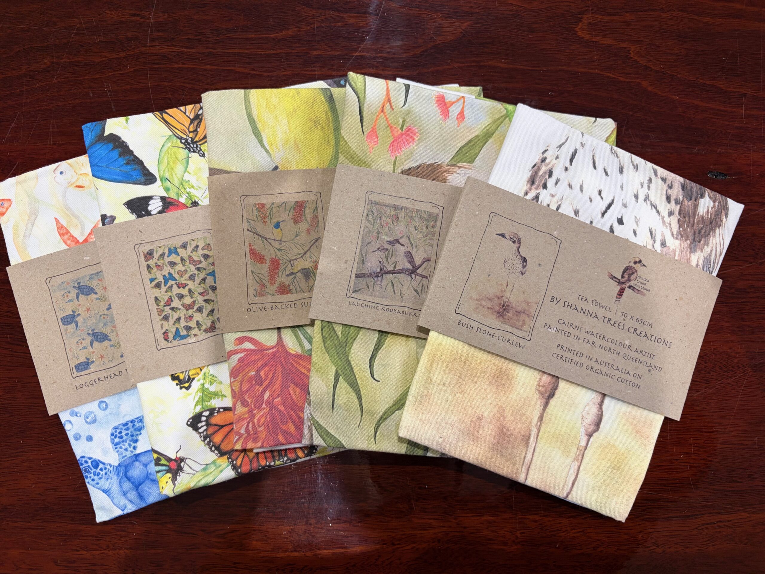 These tea towels are crafted from 100% Australian Certified Organic Cotton, ensuring a sustainable and eco-friendly choice. Featuring designs by a local FNQ artist, each piece is inspired by nature and printed in Australia. A perfect blend of artistry and functionality for your home.