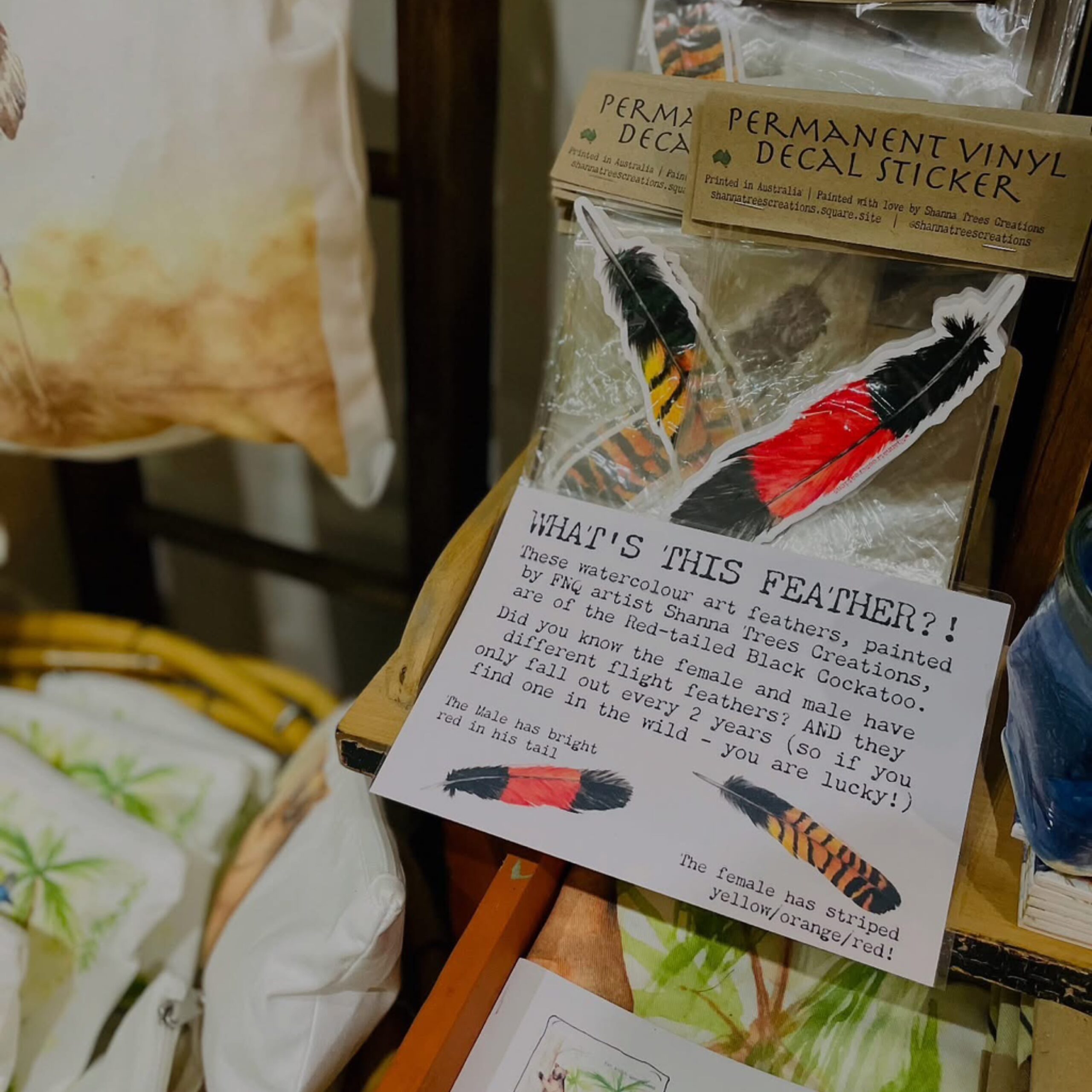 The Shanna Trees Creations Vinyl Sticker Pack "Lovers Pack" features a collection of beautifully designed stickers, including Female Feather, Male Feather, Yellow Tailed Black holographic, and Flying Red Tailed Black Cockatoo. Each sticker showcases intricate details and vibrant colors. Perfect for decorating personal items or gifting.
