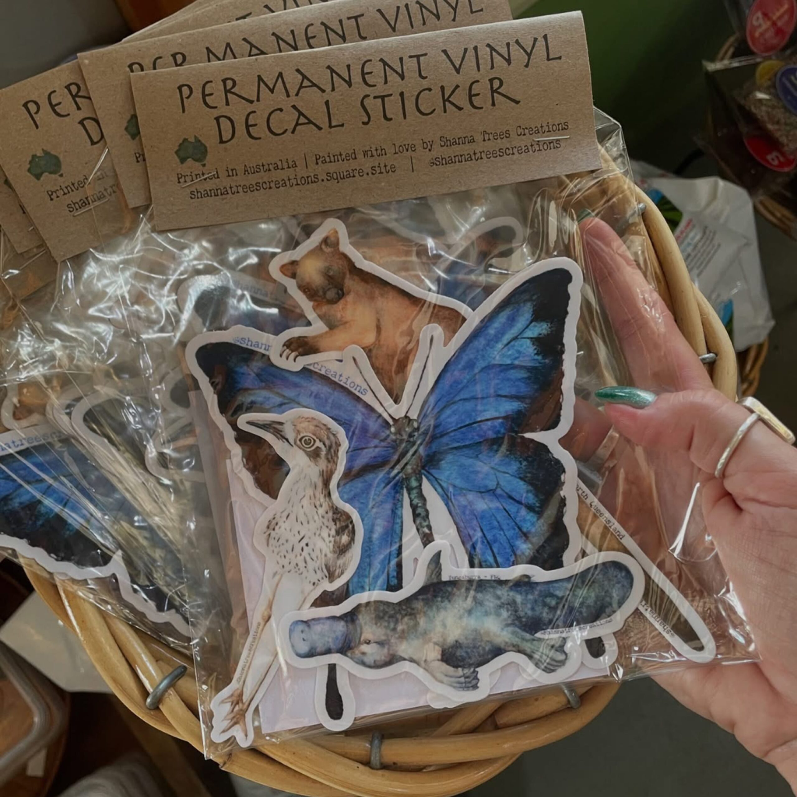 The Shanna Trees Creations Vinyl Sticker Pack 'Yungaburra Wildlife' features beautifully illustrated designs of iconic Australian animals, including the Cassowary, Curlew, Ulysses butterfly, Platypus, and Tree Kangaroo. Each sticker is crafted with durable vinyl, making them water-resistant and long-lasting. Perfect for decorating laptops, water bottles, or journals, these stickers celebrate the unique wildlife of Yungaburra.