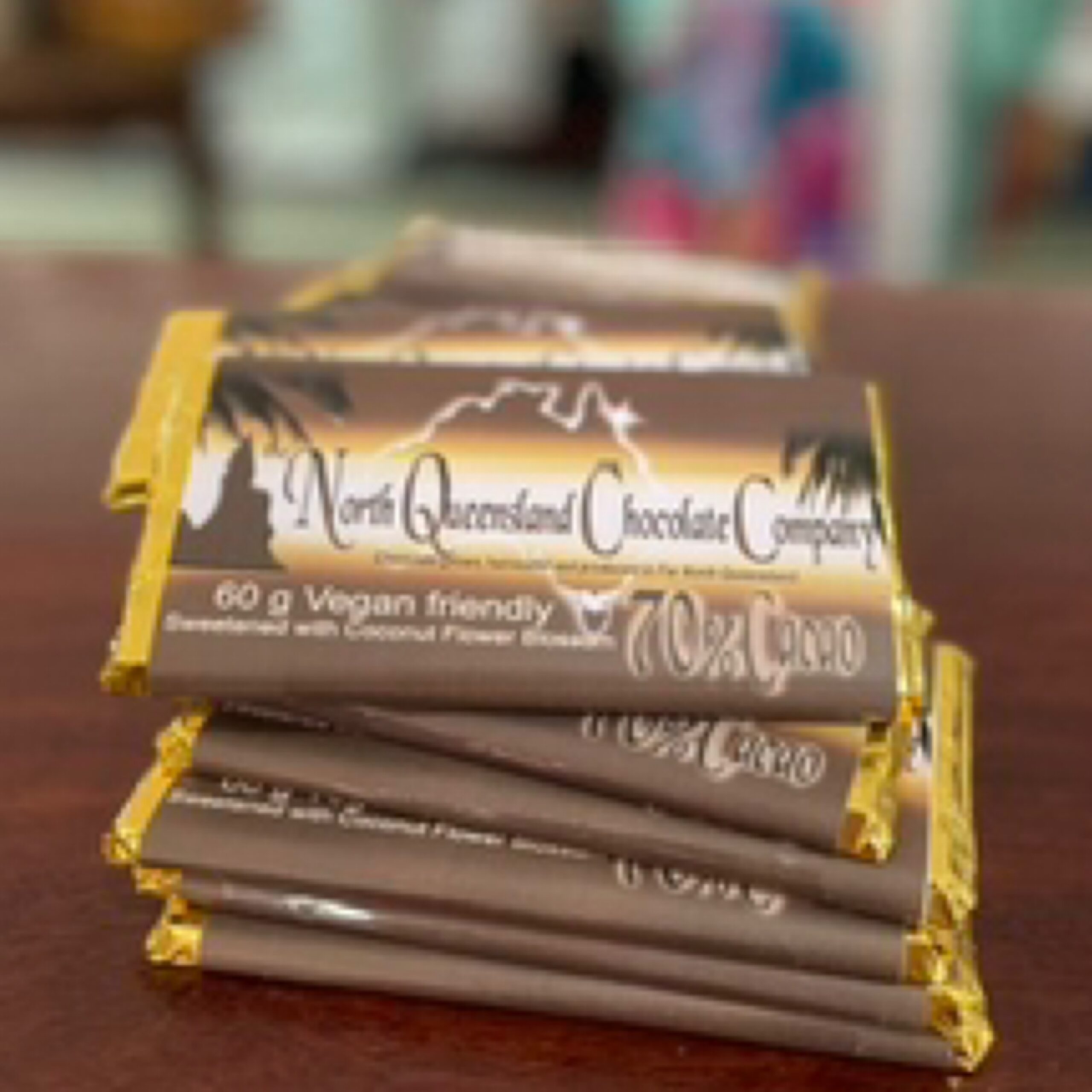 Chocolate grown,harvested and producted in Fair North Queensland 60G vegan friendly sweetened with flower blossom.70% Cacao