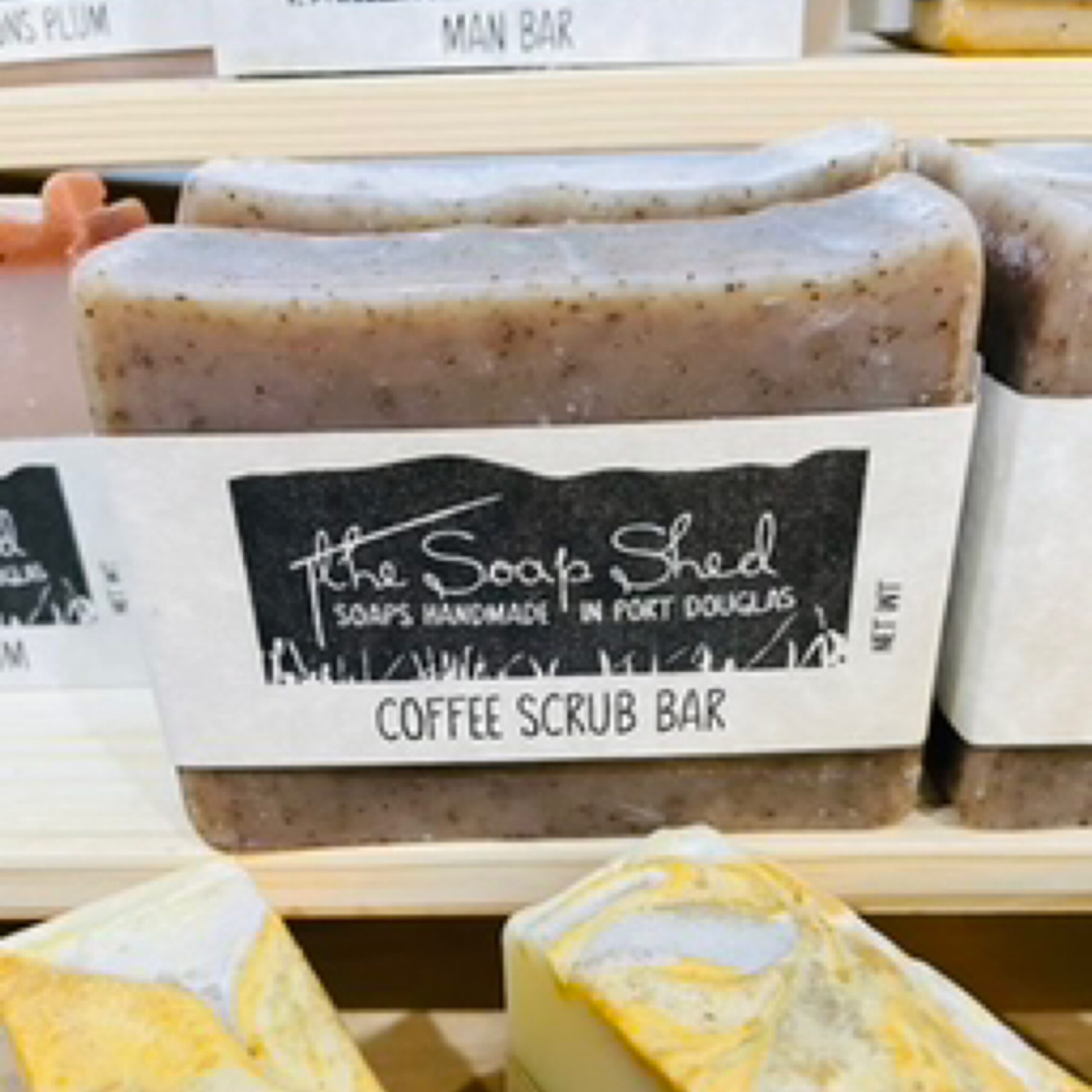 The Soap Shed Handmade SoapCoffee Scrub BarIngredients: Olive Oil, Coconut Oil, Castor Oil, Rice Bran Oil, Cocoa Butter, Kaolin Clay, Ground Coffee, Peppermint Essential OilKeep Dry Between Uses